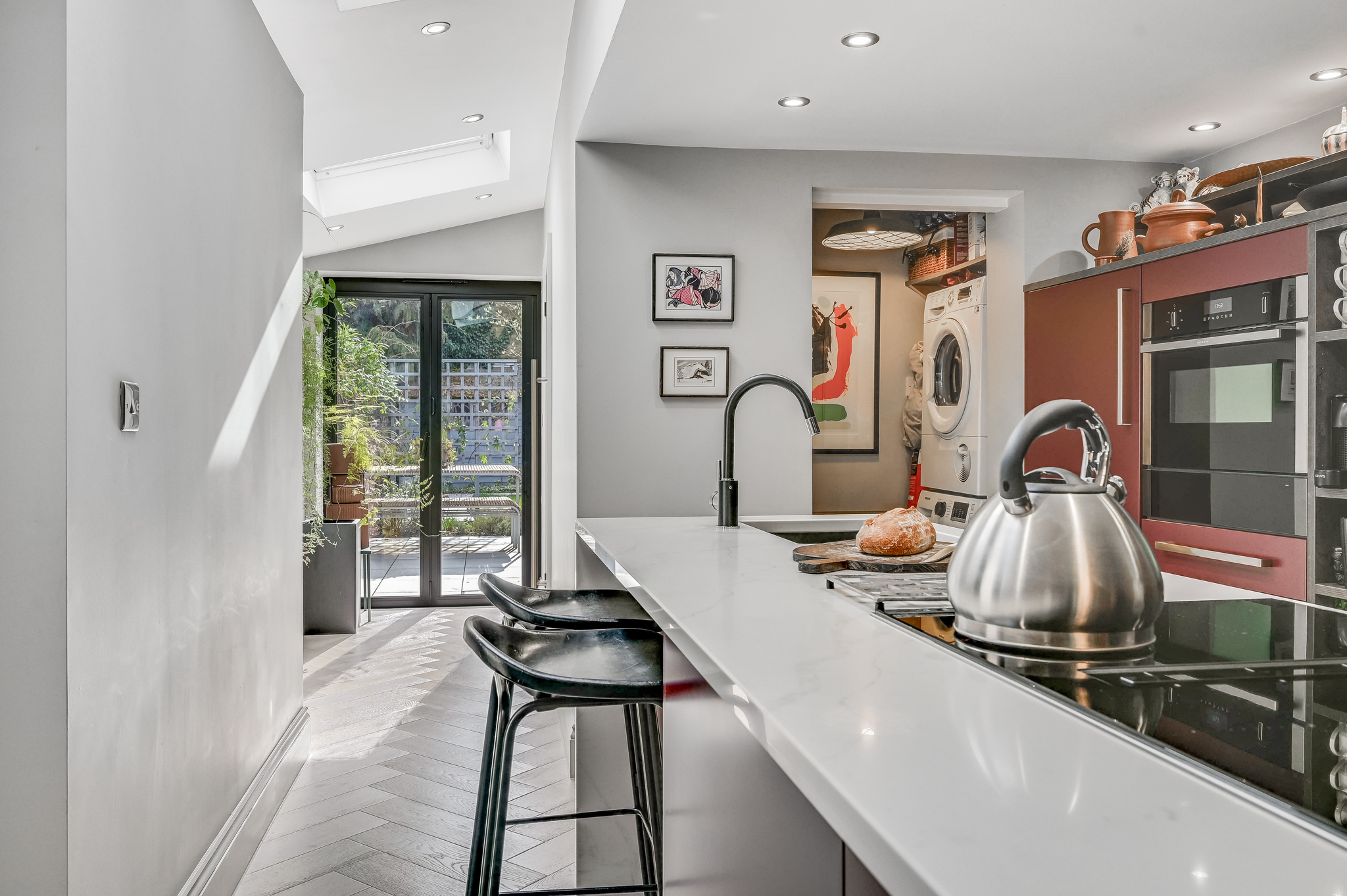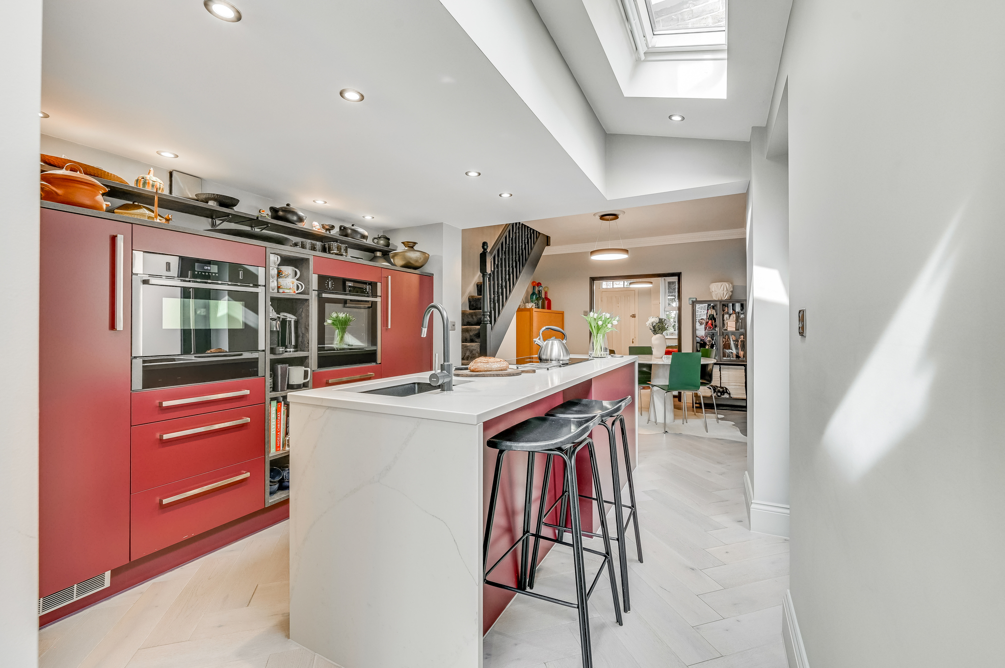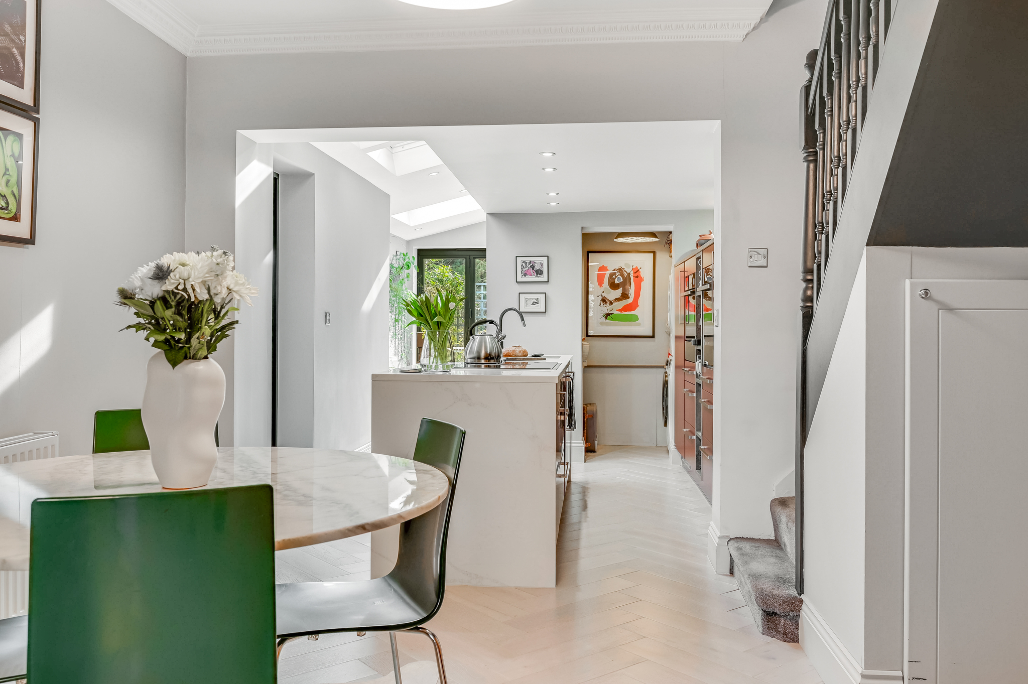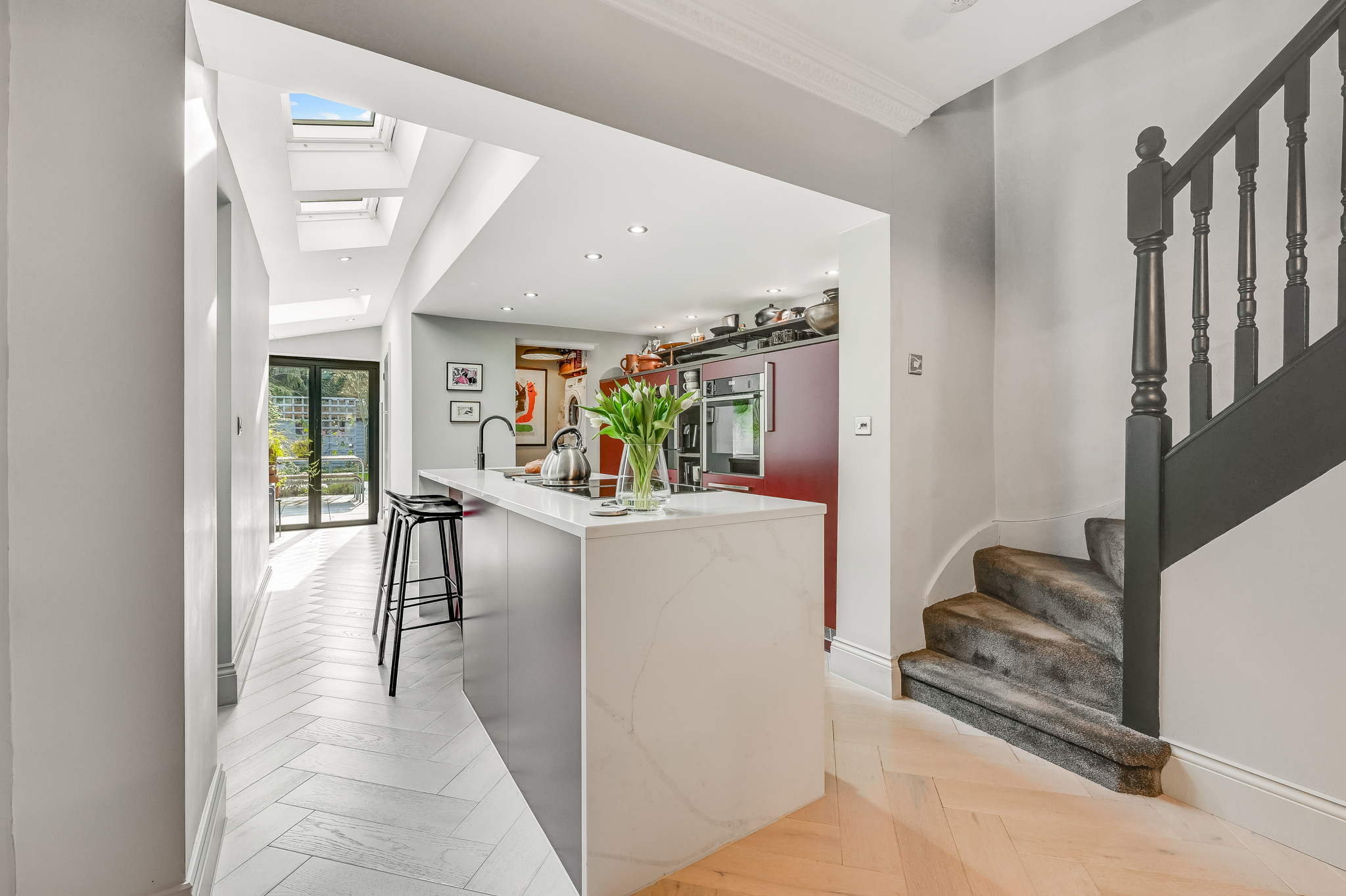 The extension features large skylights/lanterns and glazed doors, flooding the space with light and enhancing the connection to the garden. The bespoke kitchen is finished to a high specification, with sleek cabinetry, integrated appliances and a central island, perfectly suited for both everyday living and entertaining.