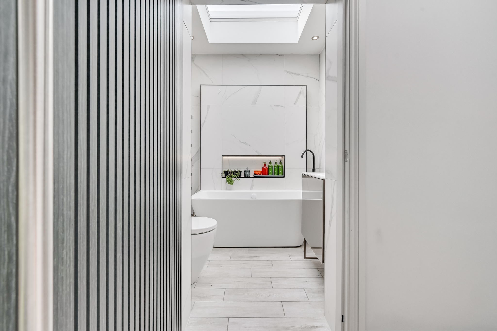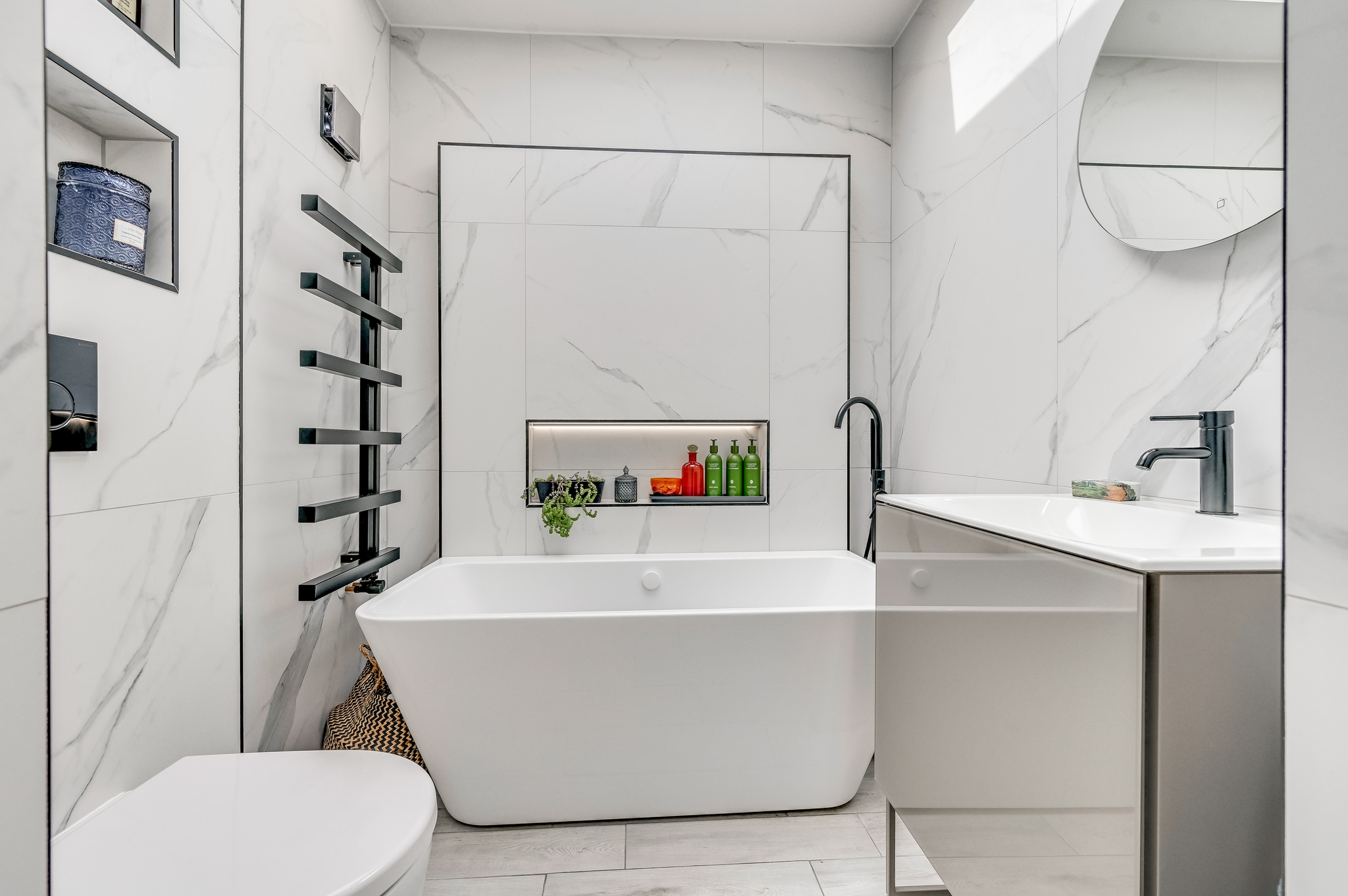 The luxury bathroom has been recently refitted in a contemporary style, featuring high-quality fittings and a refined finish, creating a space reminiscent of a boutique hotel.