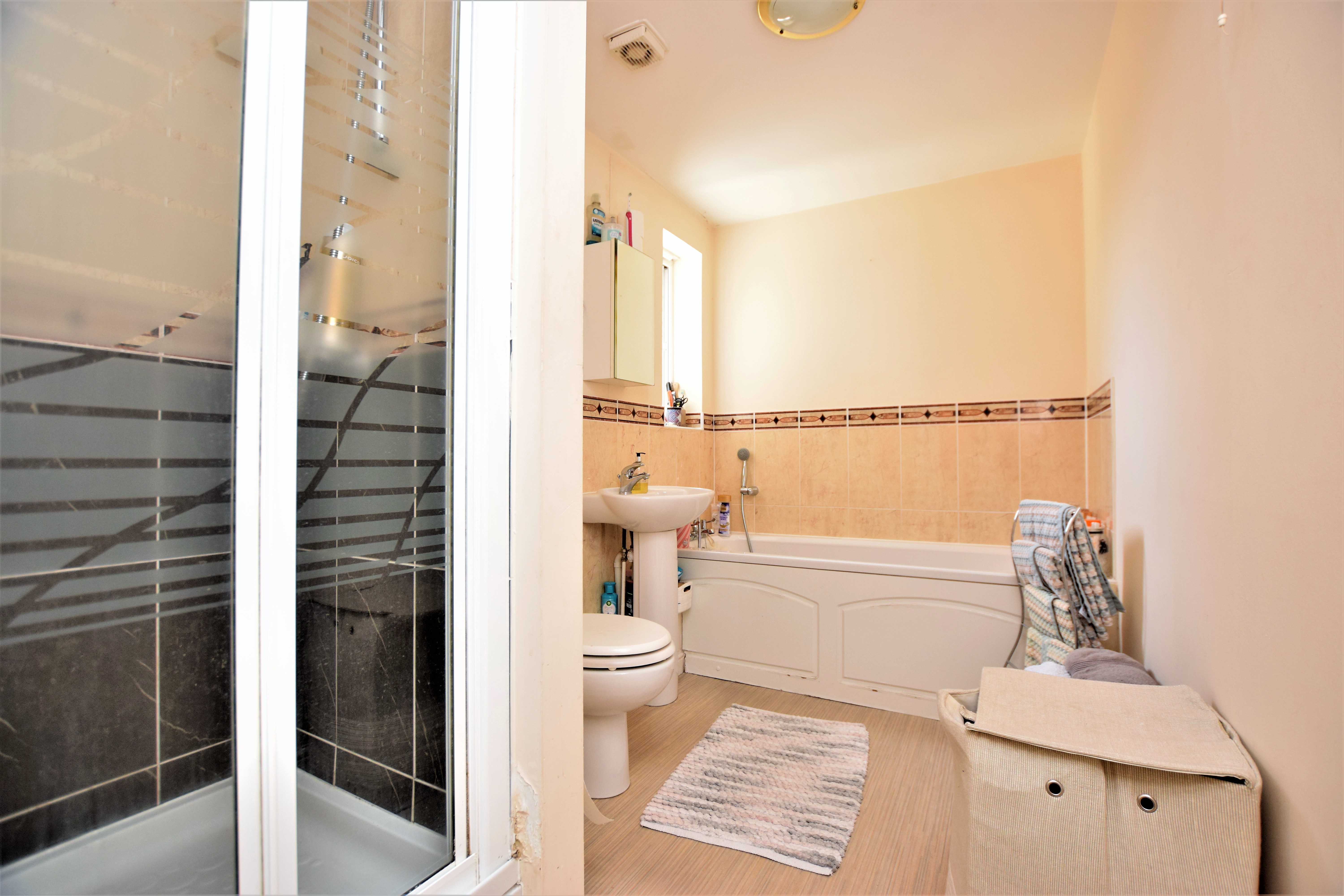 White suite comprising bath with shower attachment, sink and toilet with a mirrored bathroom cabinet. There is a shaver point with an extractor fan and a separate shower cubicle with bi fold door.