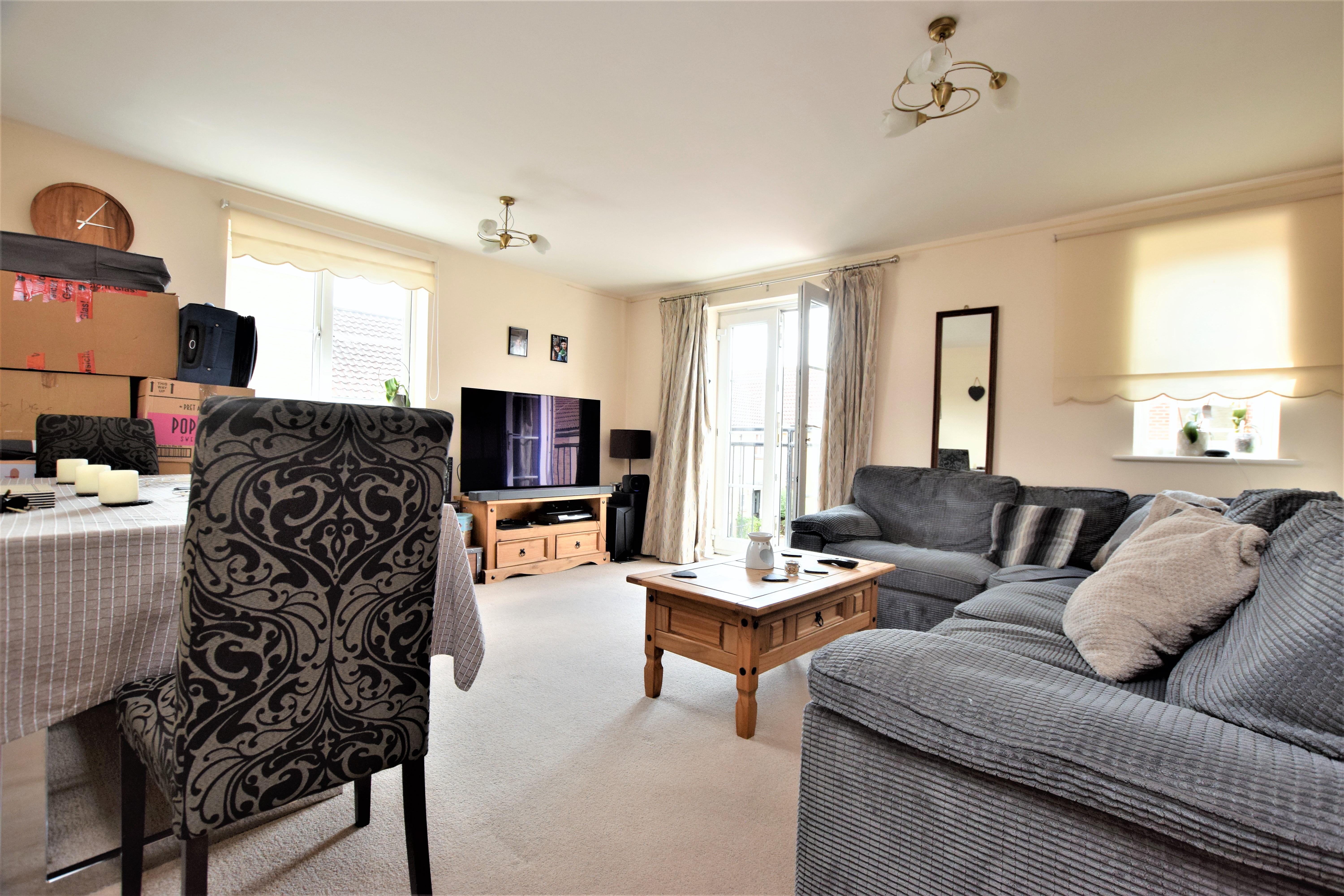 Juliet balcony and 2 UPVC double glazed windows with a carpet and storage heater