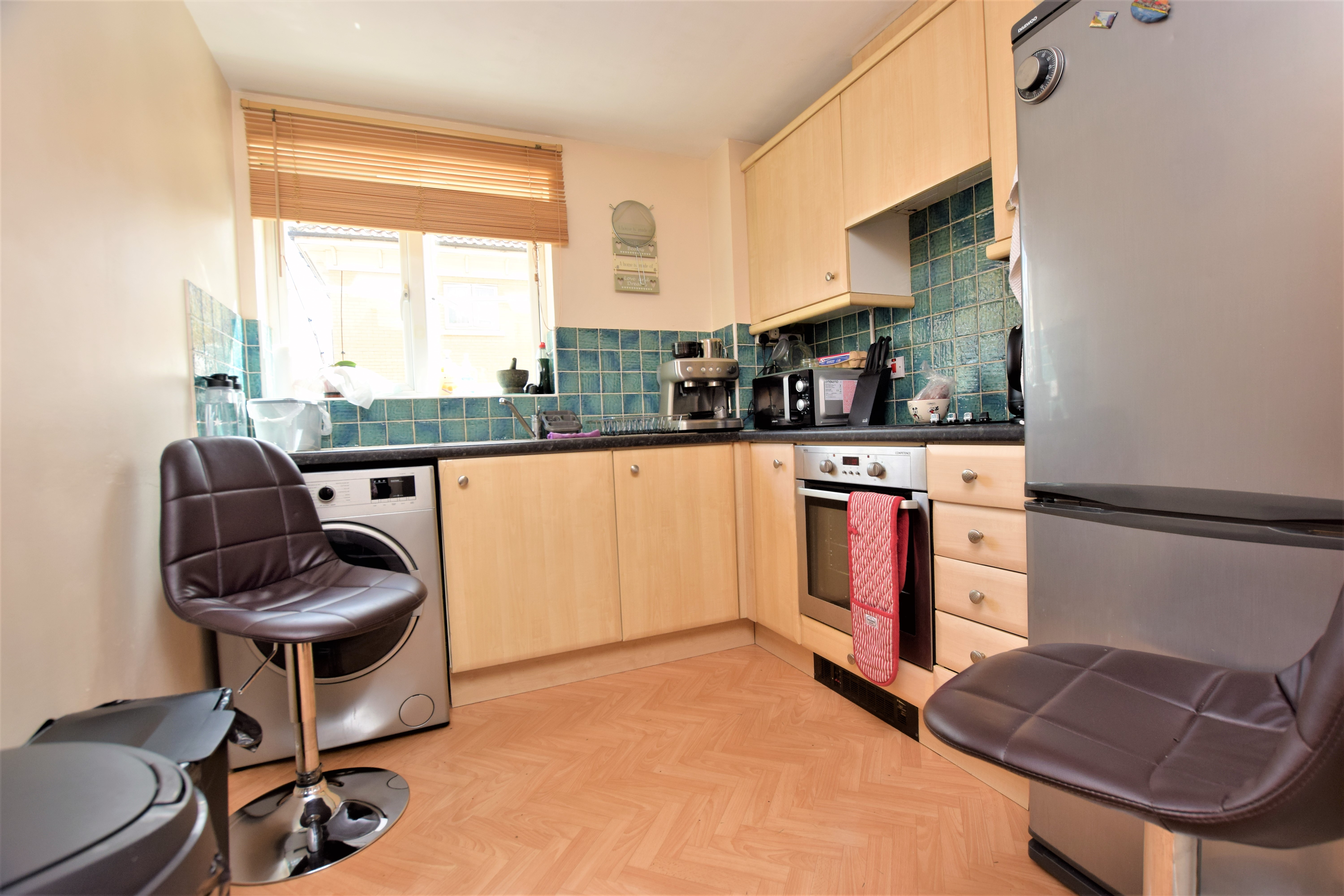 Wooden slated blind to the UPVC double glazed window, with a stone effect worktops, and part tiled walls above worktops. High and low pale wood cupboards with a washer dryer and fridge freezer.