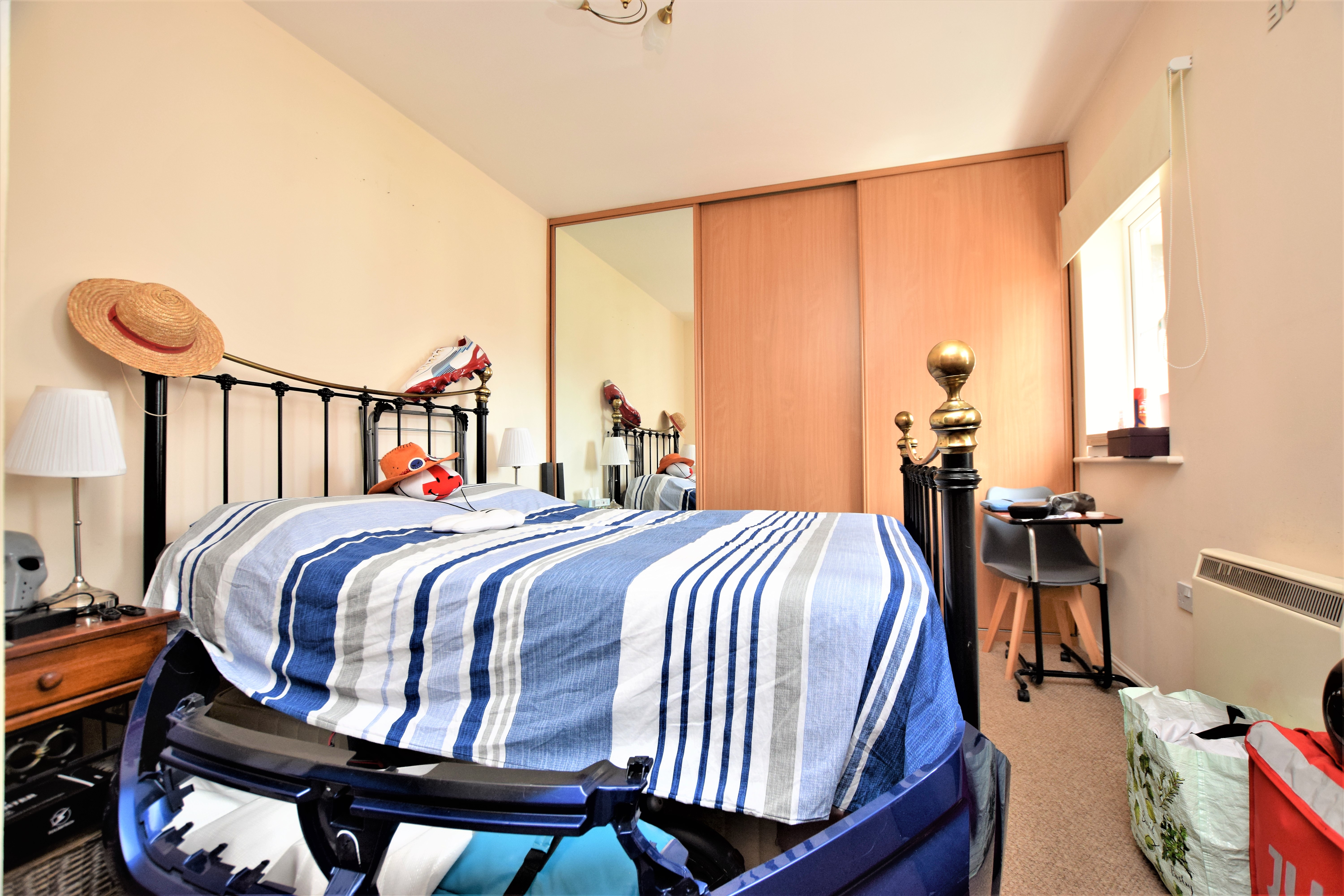 UPVC double glazed window with a fitted part mirrored triple wardrobe, carpet and storage heater